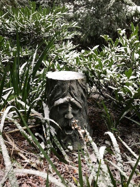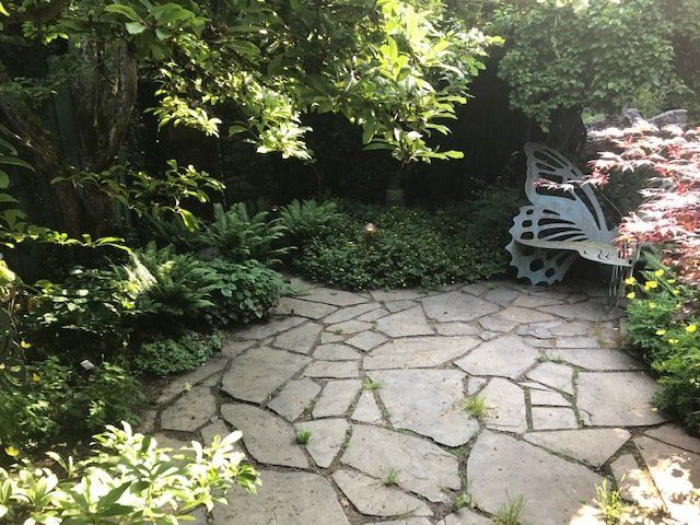 The features of the wall include a white slate birch tree, representative of her favorite white birch tree on the property that cascades over the water. There are also two windows created from river rock, which double as bird feeders so that even in memoriam she can feed and watch the birds like she so loved to do. There are two hand-blown glass Stellar Jays, one of her favorite birds that you just might see around the grounds. The central Jay is a commissioned piece with her ashes swirled through the glass. And finally, on the backside of the wall, a hummingbird. Karen loved the hummingbirds almost as much as they loved her. During wintertime, they never left, as they knew and trusted she would always have a fresh batch of nectar for them hanging from the trees.